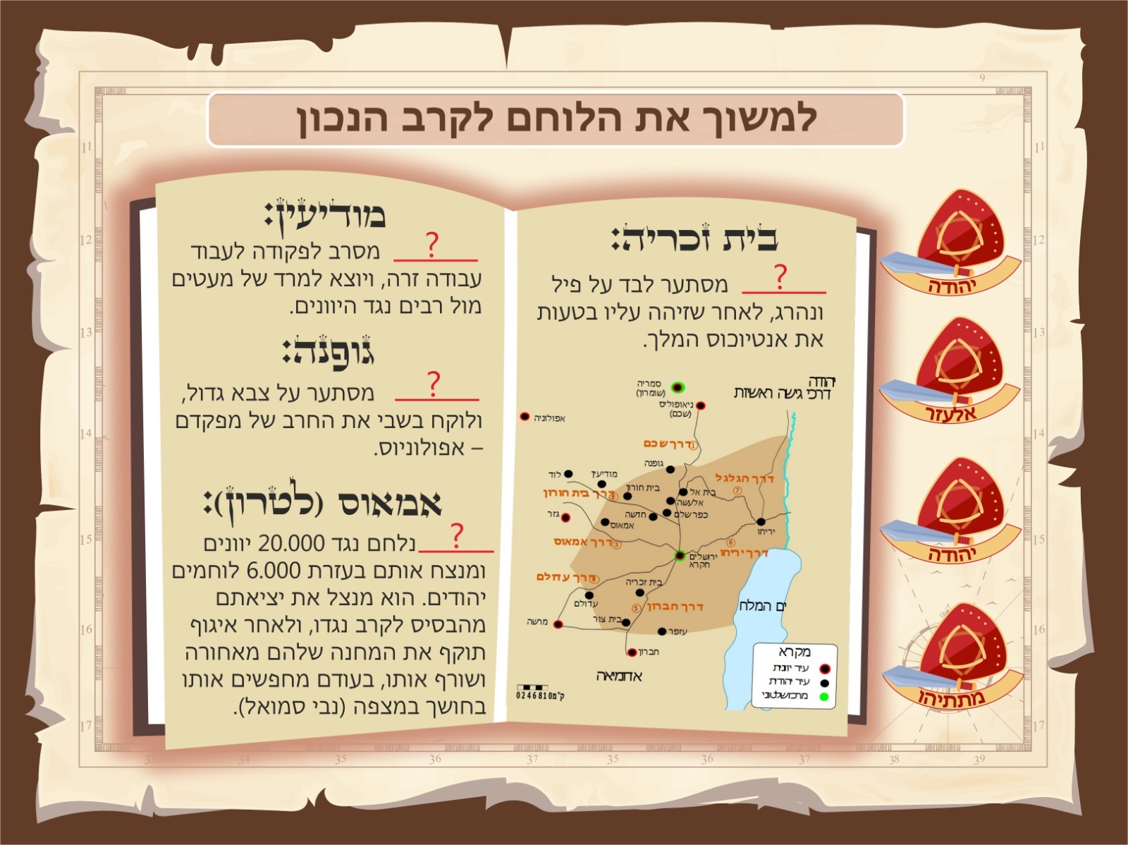 באמצעות משחקים וחידות לומדים על בית המקדש, על תקופת החשמונאים והיוונים ועל גבורה והמאבק על עצמאות יהודית.